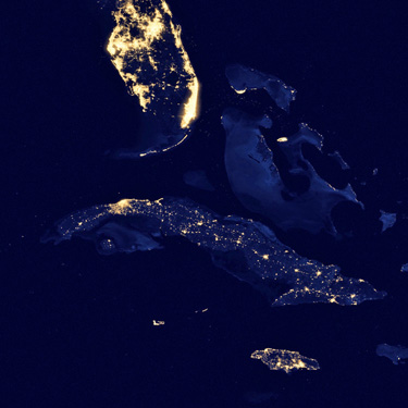 You cannot see the mainland from the Malecón, but you can see both from a satellite. Below in a Nasa image of Cuba, the bright tongue of the Florida Keys leads from Miami downward to Havana.