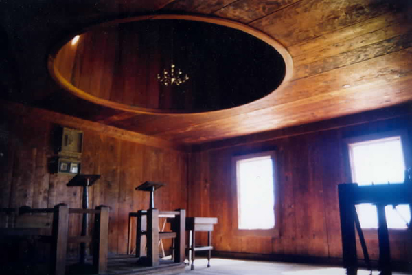 Light on two sides is the rule for a well lit, warm and glare-free room. The Fort Ross Chapel of 1850 takes a different approach with a different effect. Lit from one side, the hot spots, glare and gloominess are highly emotive with a dark presence hanging over the pulpit.